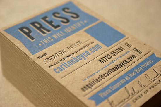 Daniel is a UK-based designer who created this stunning letter-press ‘press pass’ business card for journalist Carlton Boyce. Letterpress cards are becoming much more popular although they can also be more pricey to print.